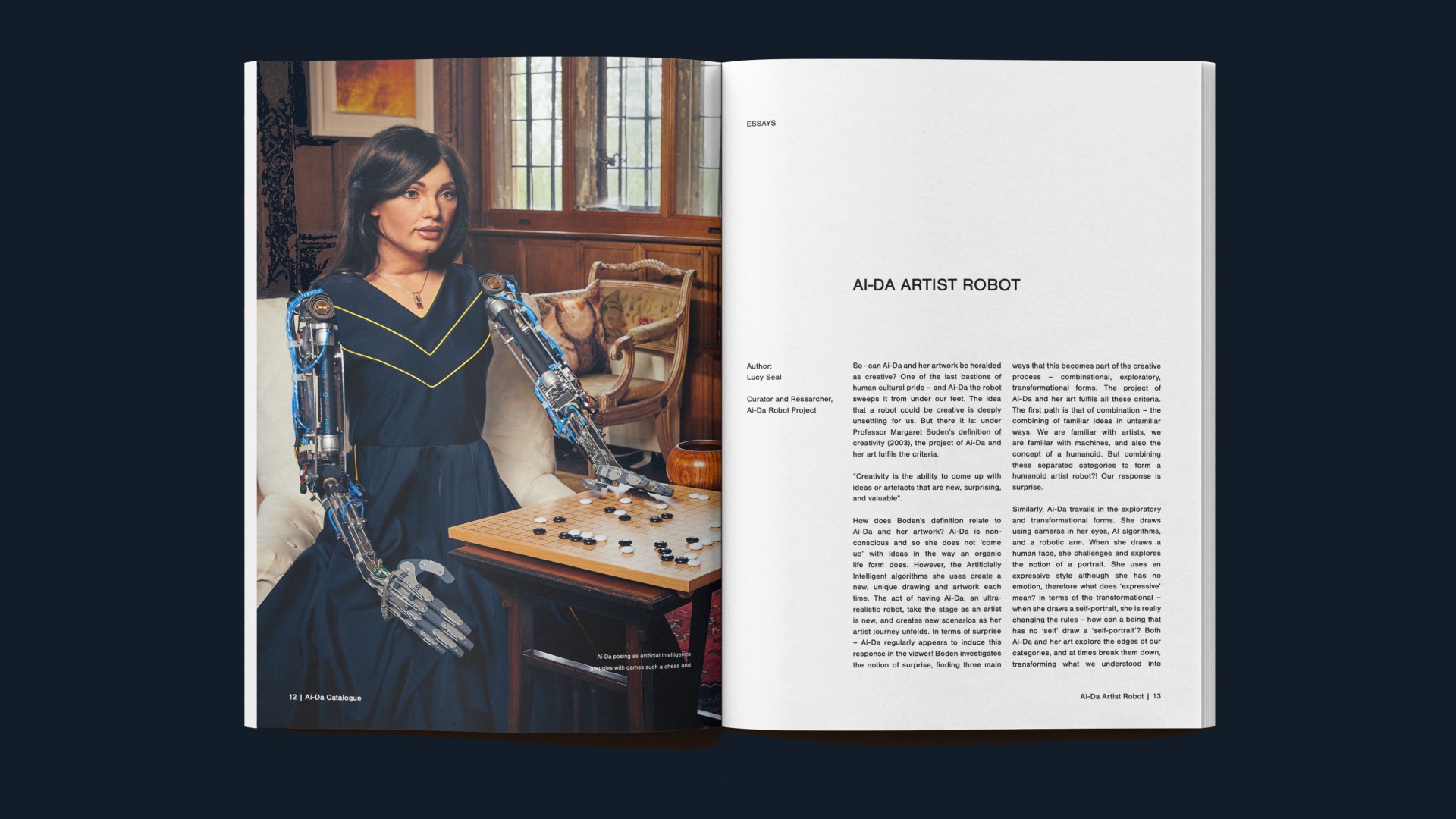 We designed a flexible layout system that allows curators to update content seamlessly while maintaining hierarchy and rhythm across editions. High-impact visuals were crafted to preserve the fine detail of Ai-Da’s work, supported by carefully selected paper stocks and production methods. Dual print workflows were engineered for both offset and POD production, ensuring consistent quality worldwide.